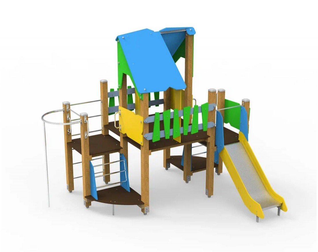 Детский игровой комплекс предназначен для организации детского досуга и физического развития на детских площадках, в детских садах, школах, парках, дворах и местах отдыха. Изделие представляет собой сборно-разборную конструкцию с декорациями из фанеры ФСФ.