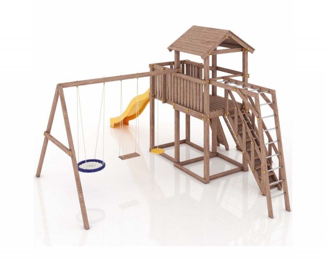 Максимально возможная комплектация в сочетании с качелями-гнездом. Детская площадка в полной комплектации позволит вашим детям разнообразить свои игры на свежем воздухе, а так же пригласить своих друзей для веселого времяпрепровождения. Места хватит всем!