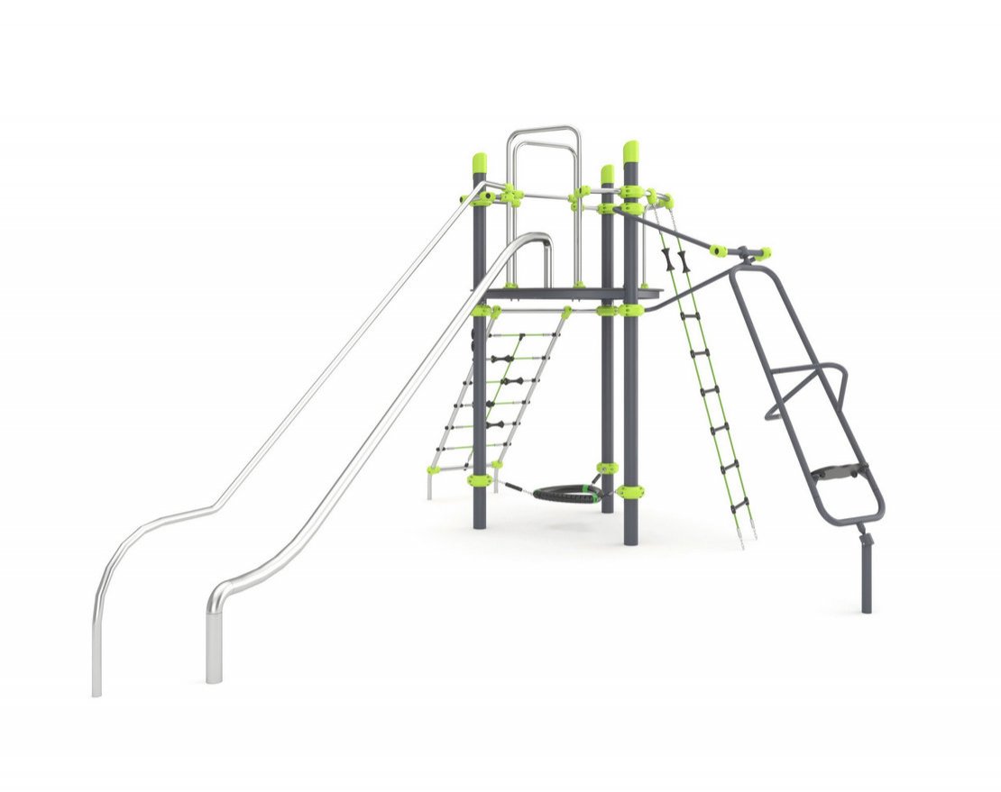 Комплекс оснащен канатными сетками, металлическими трубами-лазалками и пластиковыми уступами. На конструкции также установлена карусель-вертушка.