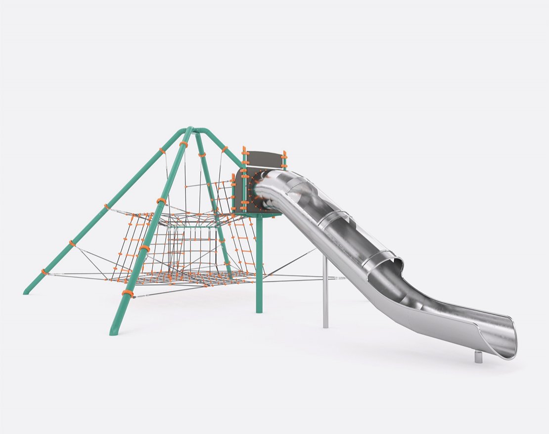 Представляет собой конструкцию, состоящую из металлического каркаса, канатных сеток, лестниц и полузакрытой металлической горки. Рассчитана для физического развития, гибкости и координации.