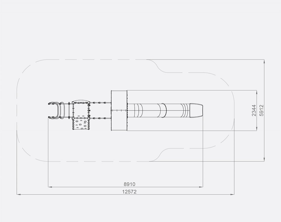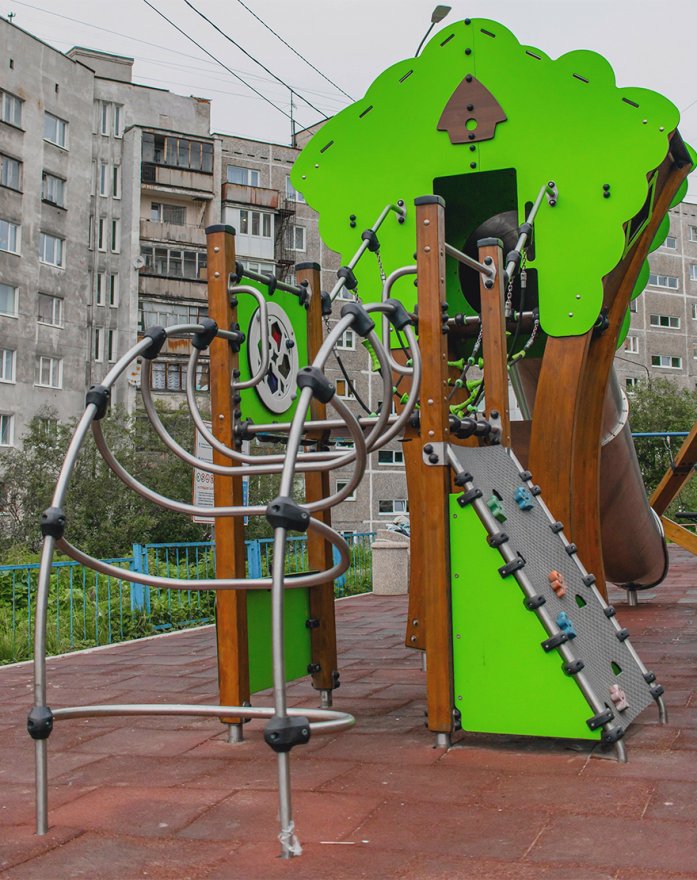 Состоит из металлических опорных стоек, канатной сетки, пластиковых панелей и закрытой тоннельной горки. Комплекс также оснащен панелью со скалодромными зацепами.