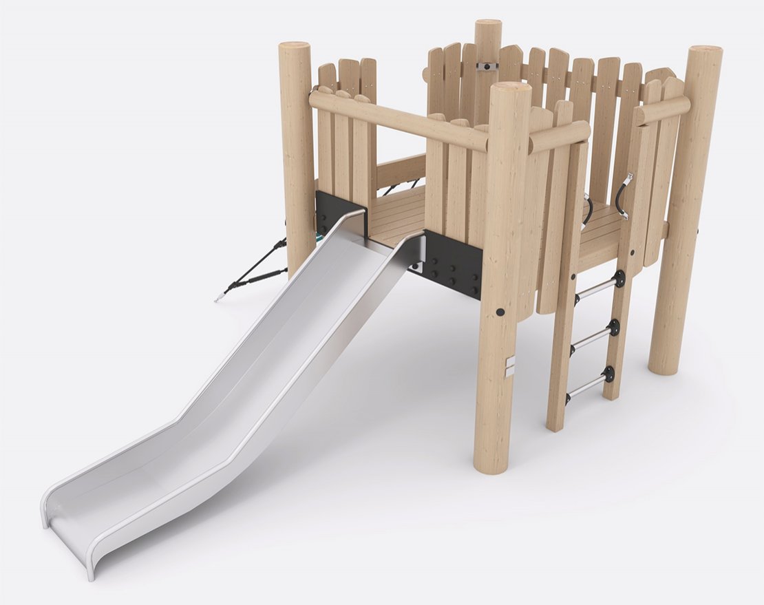 Состоит из опорных стоек, канатной сетки и металлической открытой горки с защитными бортиками. Для большего комфорта, конструкция оснащена ручками-стропами, а канатная сетка — пластиковыми уступами.