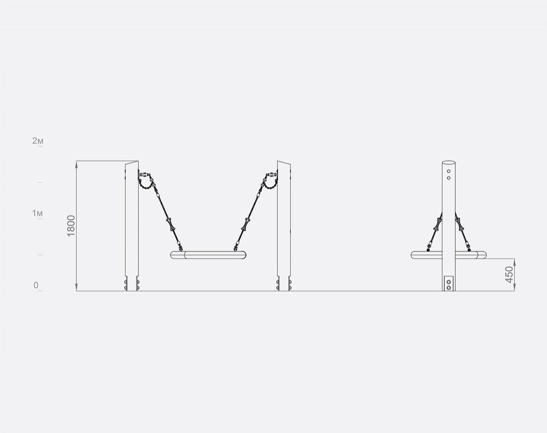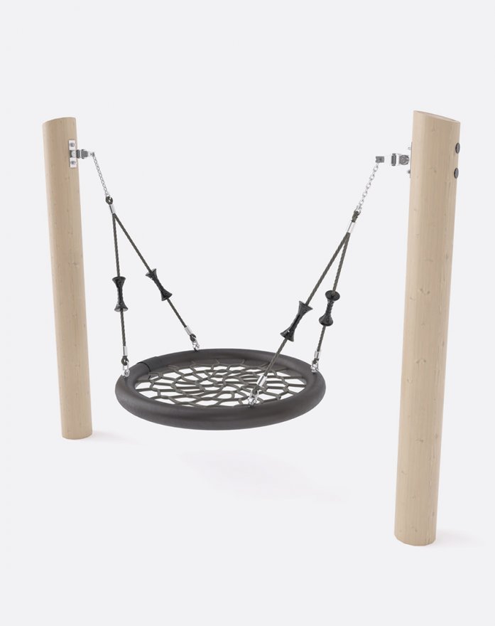 Состоят из опорных стоек, перекладины и круглого сиденья «Гнездо», выполненного из высокопрочного каната. Для большего комфорта, подвесы оснащены пластиковыми ручками.