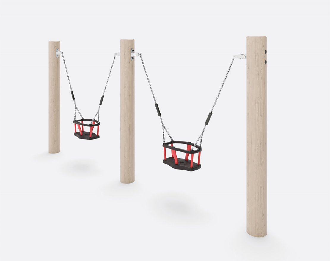Состоят из опорных стоек, перекладины и пластиковых сидений с защитными бортиками. Для большего комфорта, подвесы оснащены пластиковыми ручками.
