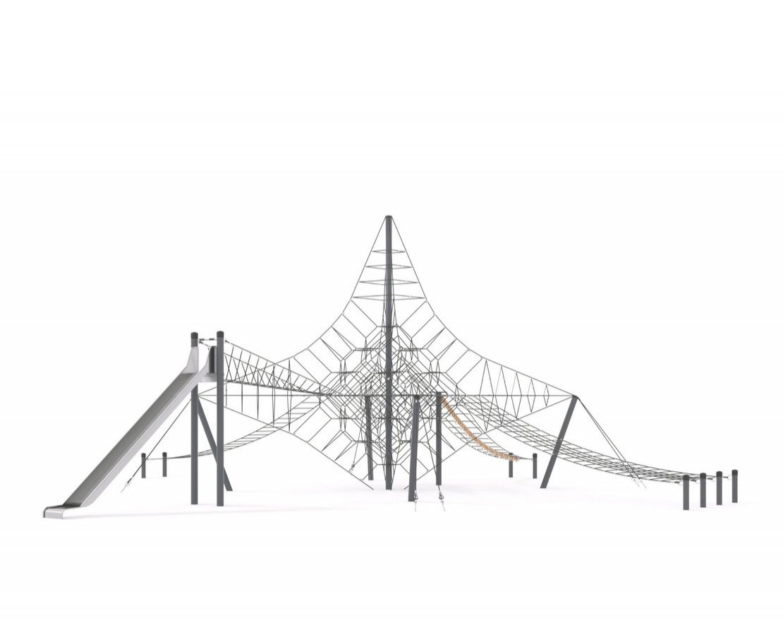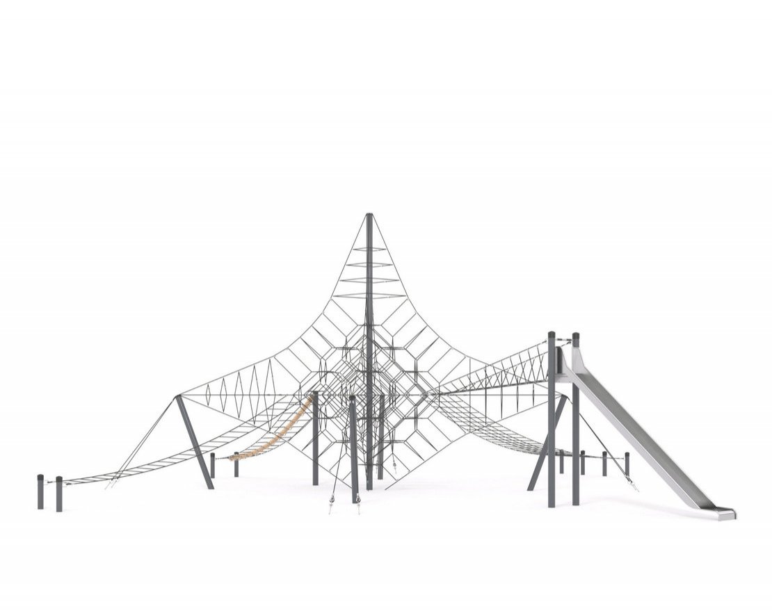 Состоит из опорной металлической стойки, высокопрочного каната, металлической открытой горки с защитными бортиками. Предназначена для развития ловкости, физической силы и координации движений.