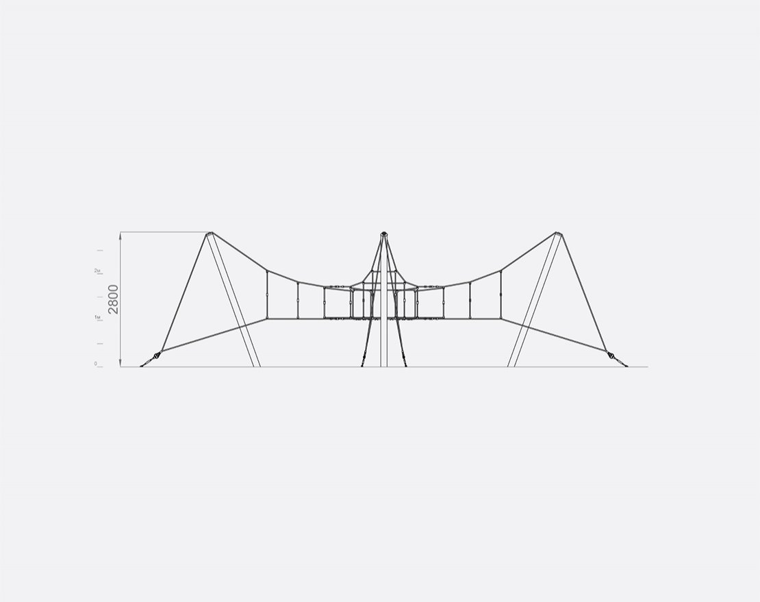 Канатная конструкция серии Skat. Состоит из канатной части и опорных металлических столбов, установленных на разной высоте. Посередине конструкции предусмотрена прорезиненная конвейерная лента, которая выполняет роль батута или элемента для отдыха.