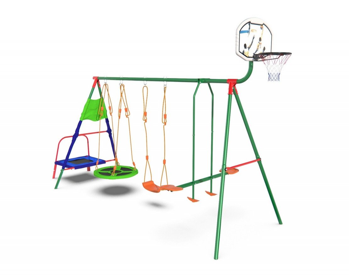 В комплекте: верёвочные качели, качели-качалки для двоих, качели-гнездо, мини-батут и кольцо для баскетбола (R18").