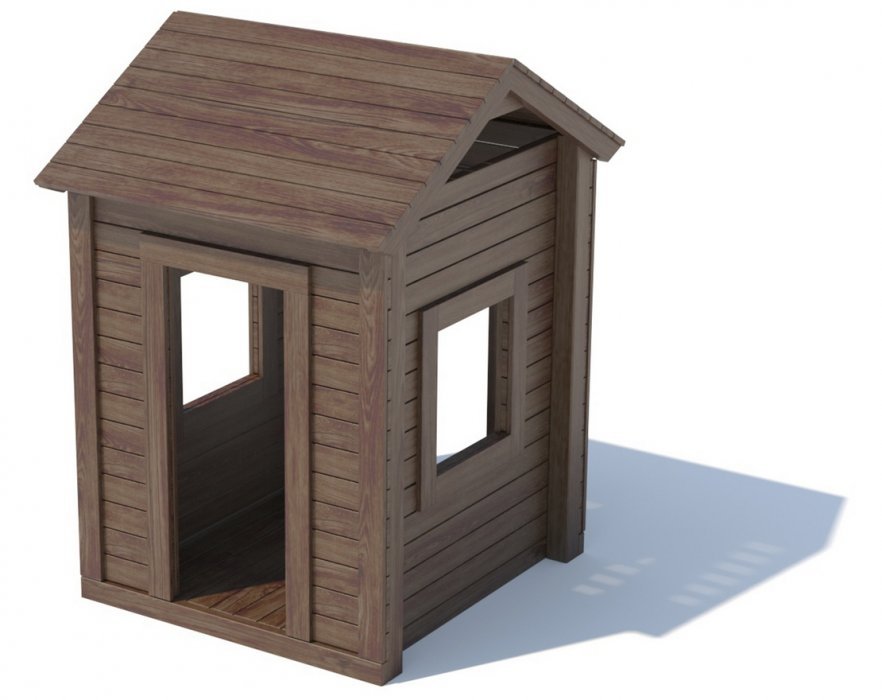Беседка состоит из каркаса, двускатной деревянной крыши, встроенный пол, стена домика с дверным проемом и три стены домика с оконными проемами. Рекомендуем дополнить модель лавочкой для домика.