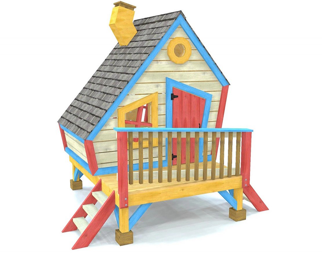 Основная конструкция домика приподнята на 60 см над землей, чтобы можно было проложить короткую лестницу и горку. Также предусмотрена входная дверь и пять оконных проемов. Асимметричная планировка добавит веселья и игривости, что понравится маленьким детям.
