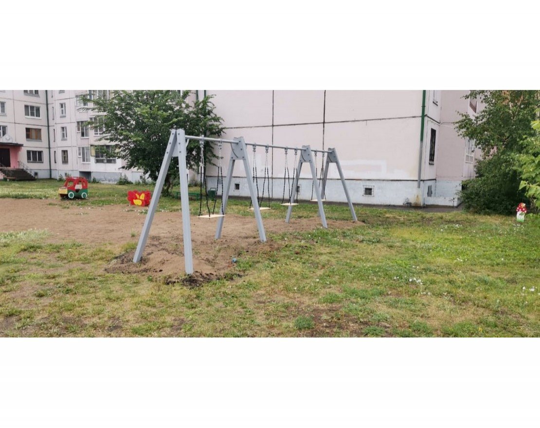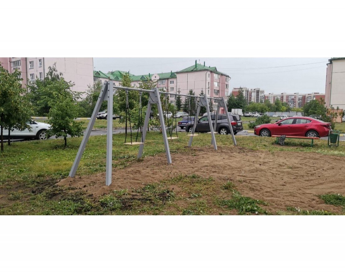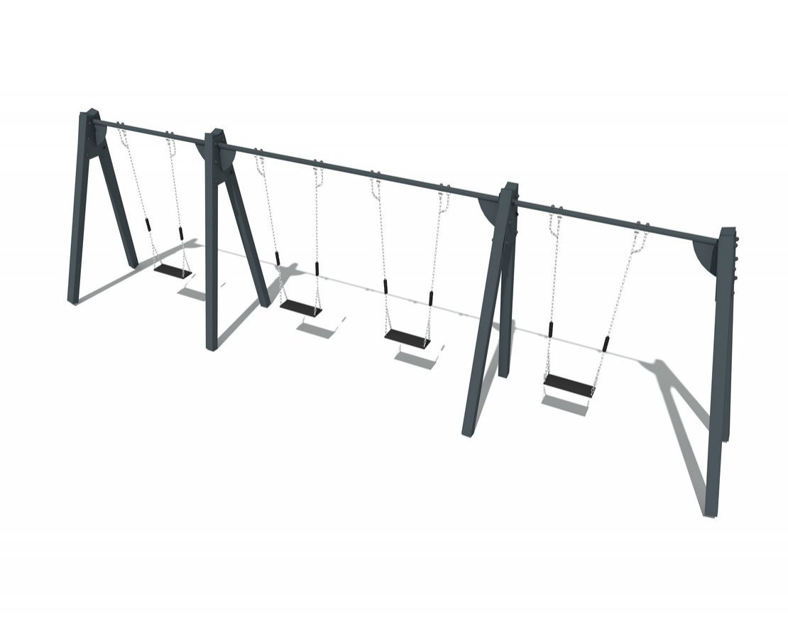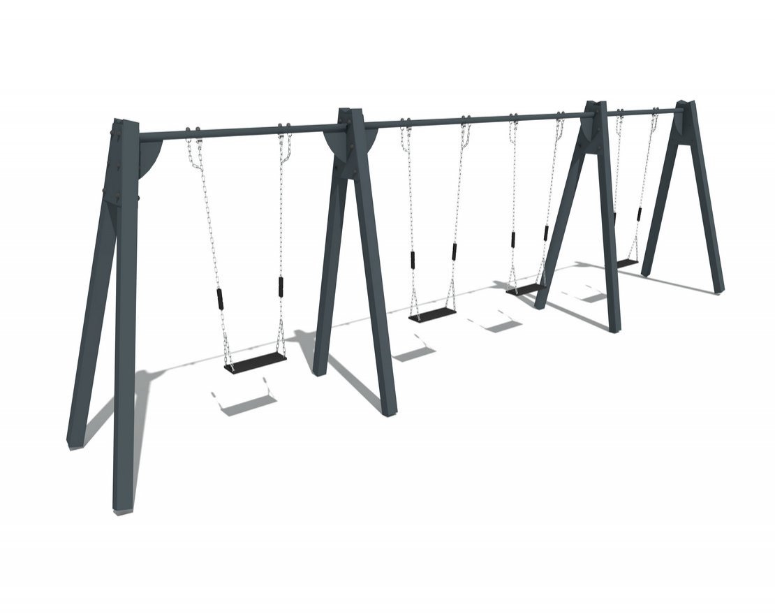 Качели на металлических стойках оснащены 4-мя простыми сидениями без спинок. Изделие предназначено для установки в парках, общественных дворах.