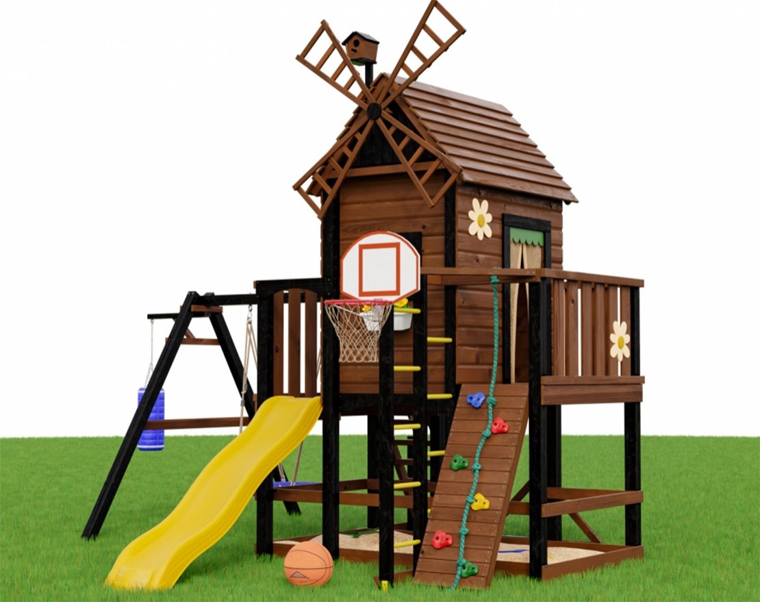 Игровой комплекс Мулен 1 — это уютный деревянный домик, наполненный атмосферой приключений. Его узнаваемый силуэт с декоративными лопастями на крыше перенесет детей в мир сказок, где можно представить себя отважным путешественником, хозяином мельницы или капитаном воздушного корабля. Площадка сочетает различные игровые и спортивные элементы, помогая ребенку развивать ловкость, силу и координацию. Лестницы, канаты, качели и горка превращают игру в увлекательное приключение, в котором важно не только фантазировать, но и двигаться. Внутри домика продумано всё до мелочей — каждый уголок наполнен возможностями для игры, творчества и удобства. На втором этаже маленьких художников ждет доска для рисования, где можно воплощать свои фантазии. Два отдельных столика со стульчиками позволяют детям играть, рисовать или устраивать чаепитие, не мешая друг другу. А просторная песочница под домиком станет местом для совместных экспериментов с песочными замками — здесь хватит места всем! Два раздельных входа делают пространство более просторным и удобным, создавая еще больше возможностей для веселой и динамичной игры.