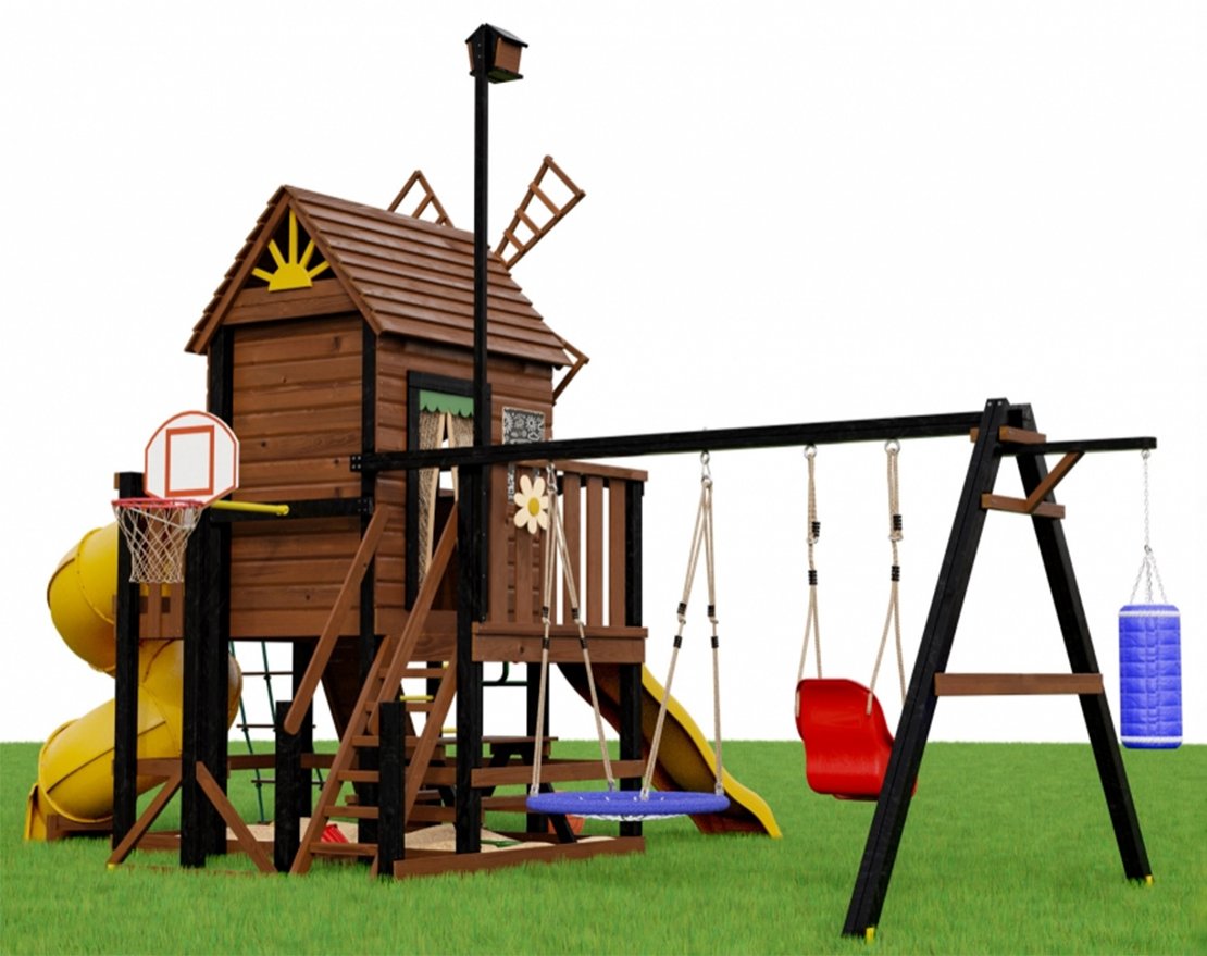 Игровой комплекс Мулен 5 — это уютный деревянный домик, наполненный атмосферой приключений. Его узнаваемый силуэт с декоративными лопастями на крыше перенесет детей в мир сказок, где можно представить себя отважным путешественником, хозяином мельницы или капитаном воздушного корабля. Площадка сочетает различные игровые и спортивные элементы, помогая ребенку развивать ловкость, силу и координацию. Лестницы, канаты, качели и горка превращают игру в увлекательное приключение, в котором важно не только фантазировать, но и двигаться. Внутри домика продумано всё до мелочей — каждый уголок наполнен возможностями для игры, творчества и удобства. На втором этаже маленьких художников ждет доска для рисования, где можно воплощать свои фантазии. Два отдельных столика со стульчиками позволяют детям играть, рисовать или устраивать чаепитие, не мешая друг другу. А просторная песочница под домиком станет местом для совместных экспериментов с песочными замками — здесь хватит места всем! Два раздельных входа делают пространство более просторным и удобным, создавая еще больше возможностей для веселой и динамичной игры.