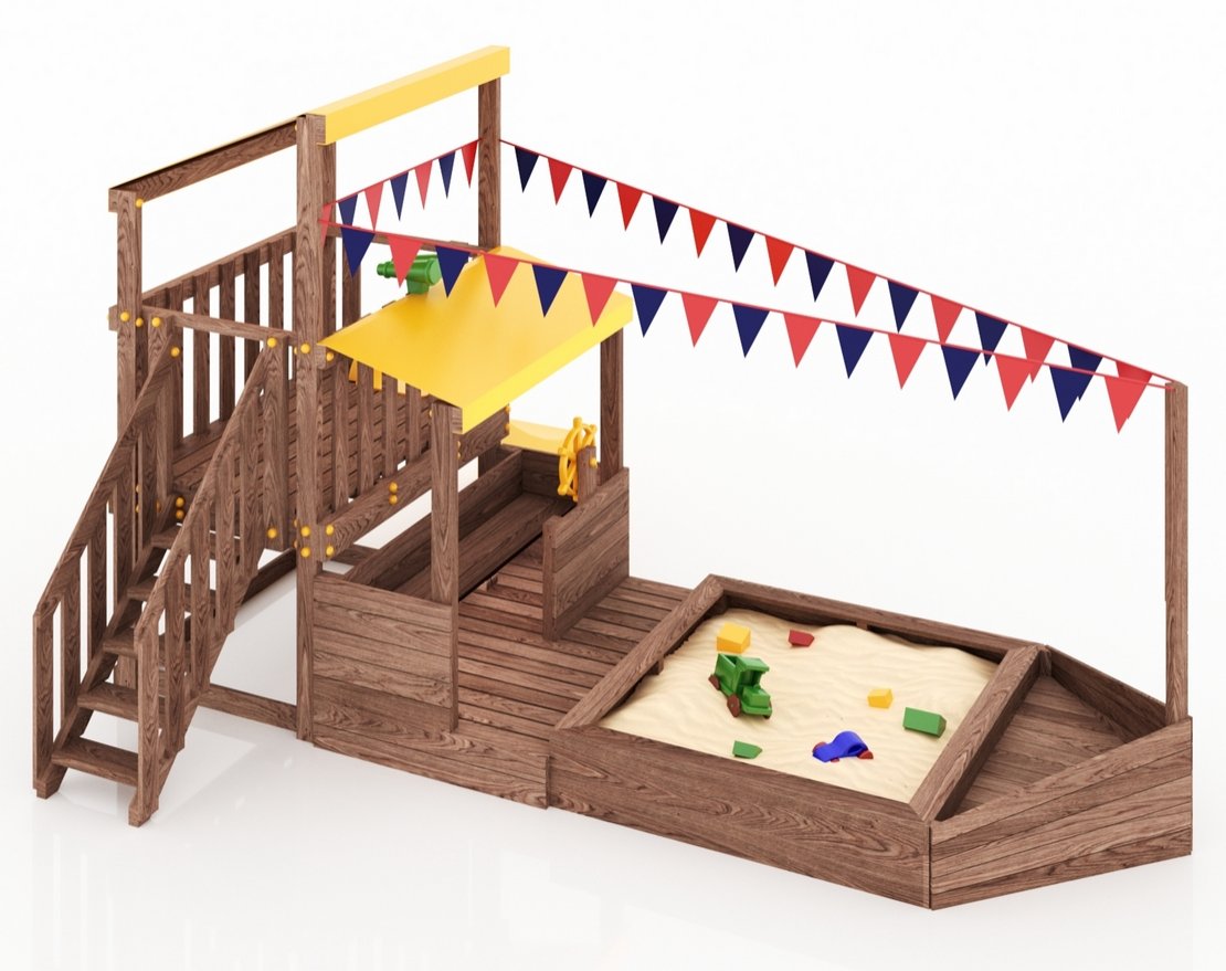 Детская песочница-кораблик, включающая в себя штурманскую рубку и капитанский мостик с горкой с высоты 900 мм с флажками, а также две крыши закрытые тентом, чтобы можно было отправиться в дальнее плавание даже под дождем.