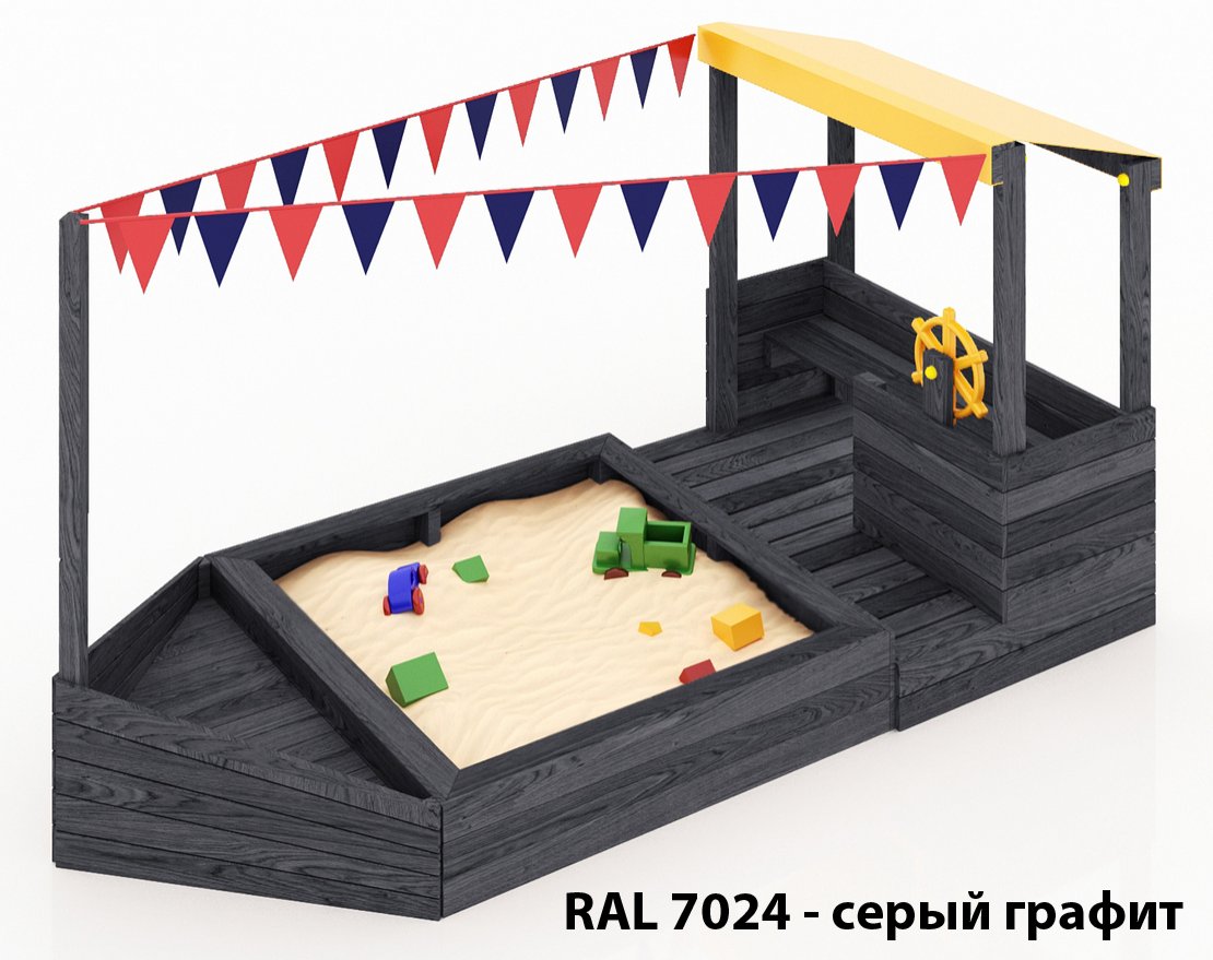 Детская песочница-кораблик и штурманская рубка со штурвалом с тентовой крышей.