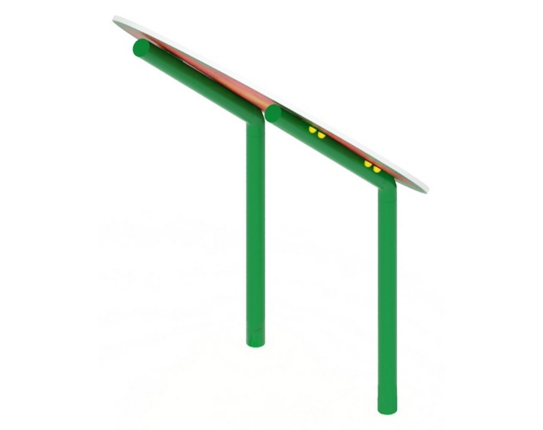 Выполнена из труб диаметром 42 мм, металл имеет плавные радиусы, тщательную обработку швов, покрыт порошковой краской в зеленый цвет. Размеры: 1893х547х50(h) мм.