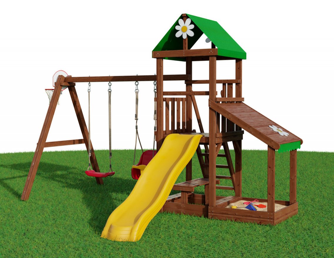 Самые маленькие будут рады удобным и безопасным качелям с высокими бортиками. Рядом – модель для ребят постарше. Шумной компанией весело кататься с горки или играть в баскетбол. В пространстве под горкой расположен столик и скамейки, а рядом – песочница, защищенная от дождя и солнца крышей.