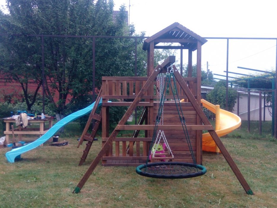 Каждая деревянная деталь детской игровой - спортивной конструкции состоит из древесины сибирской лиственницы: клееный и сращенный брус лиственницы сечением 90х90мм.; клееный и сращенный брус лиственницы сечением 80х40мм., доска – планкен из лиственницы сечением 90х20мм. (камерная сушка, влажность 8-16%). Каждая деревянная деталь обработана безопасным для детей покрытием в два слоя – маслом для террасной доски и восковой лазурью «ADLER» цвет «орех», со стороны торцов дополнительно запечатана мастикой. При желании, вы сможете самостоятельно обновлять покрытие деревянных элементов конструкции (при естественном износе покрытия один раз в 2-3 года) или проводить реставрацию отдельных конструктивных элементов (при механическом повреждении), главное подобрать по цвету масло для террасной доски, предназначенное для эксплуатации на улице.