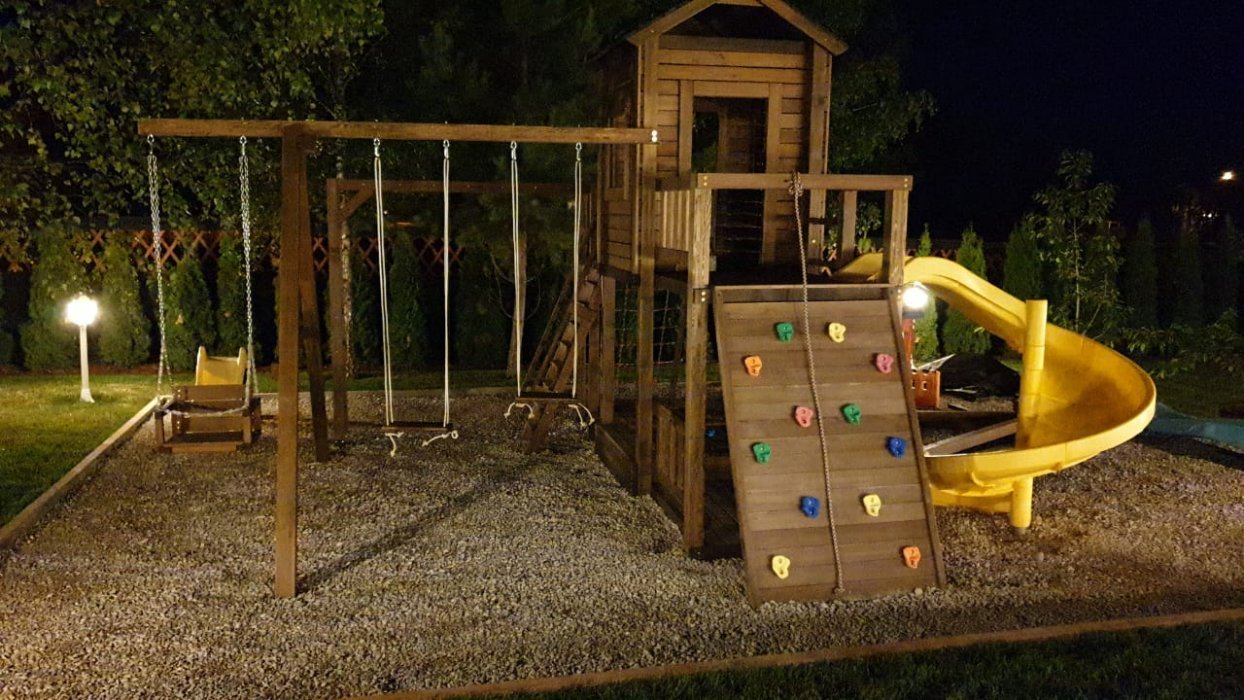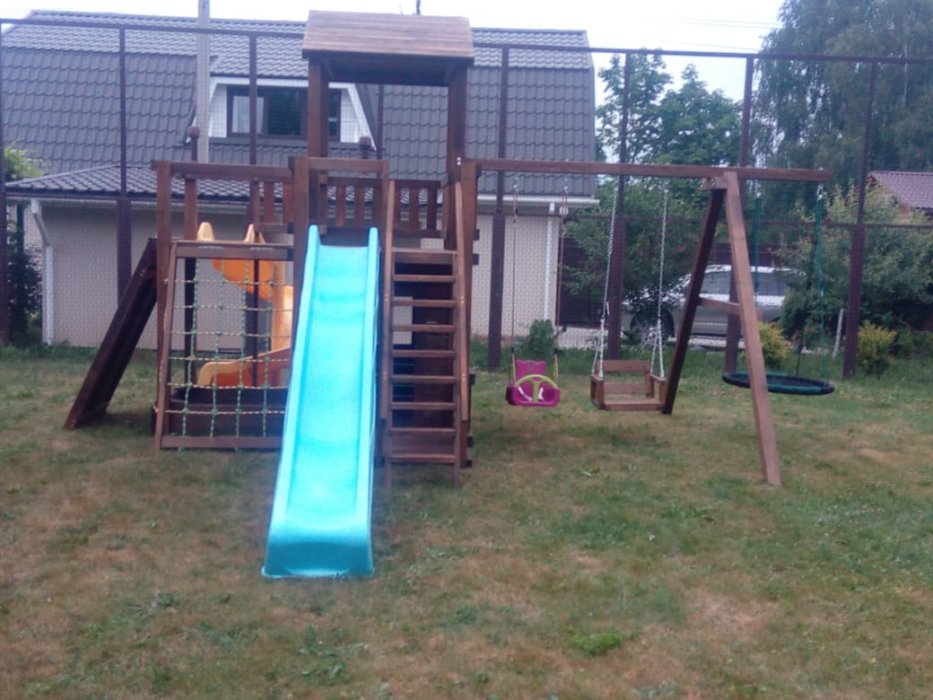 Фурнитура от европейского производителя «КВТ» (скаты, сидения для качелей, игрушки, канаты, крепежи), надежная и долговечная, защищена от воздействия УФ излучения (не выгорает), влагостойкая и морозостойкая, диапазон эксплуатации от - 60°С до +60°С. Пластиковый скат обладает отличной скользящей поверхностью, защитой от воздействия солнечных лучей (не греется, не выгорает), не образует статического напряжения, можно использовать как водную горку.