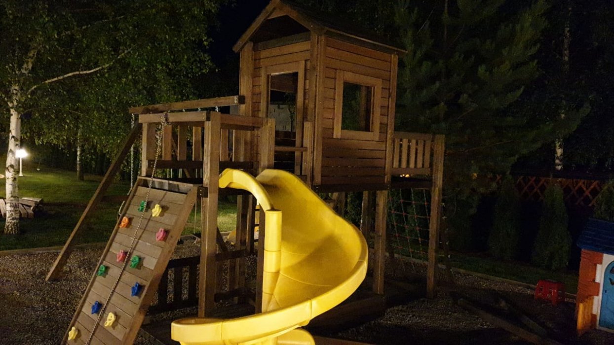 Основа детской игровой - спортивной конструкции - башня с террасой и игровой платформой. Конструкция оснащена двускатной деревянной крышей, встроенным домиком в верхней части конструкции, встроенной песочницей с крышкой «трансформер» в нижней части конструкции, дополнительной платформой в основании конструкции, пластиковым волнообразным скатом и винтовым скатом с превосходной скользящей поверхностью, деревянной лестницей, широким скалодромом, канатной лестницей, деревянным рукоходом, шведской стенкой, приставными качелями, сидением качели «гнездо», сидением качели «малютка», гимнастическими кольцами, подвесной лестницей. Для безопасности ребенка предусмотрены перила на лестнице, заборчики и ограждения над зонами препятствий (скалодром, канатная лестница, скат).