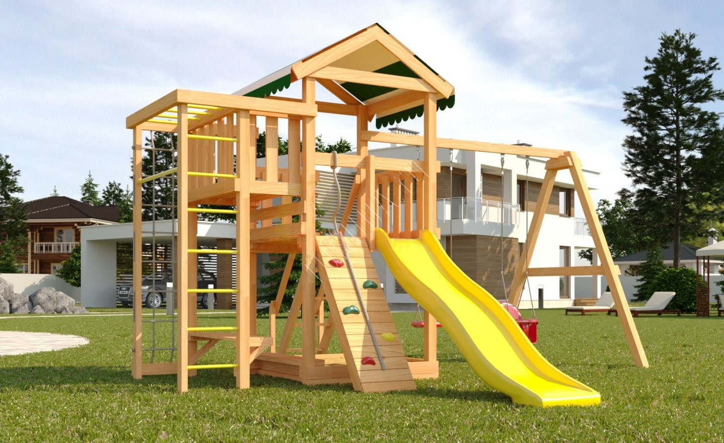 Конструкция сертифицирована и безопасна. Крепежи скрыты под хорошо закрепленными заглушками – поэтому даже малыши не поранятся. Каркас состоит из натуральных деталей – клееного бруса квадратного сечения со стороной 75 мм. Во избежание получения заноз и ссадин дерево отшлифовано, а края скруглены. Материал экологичен и не имеет лакокрасочного покрытия.