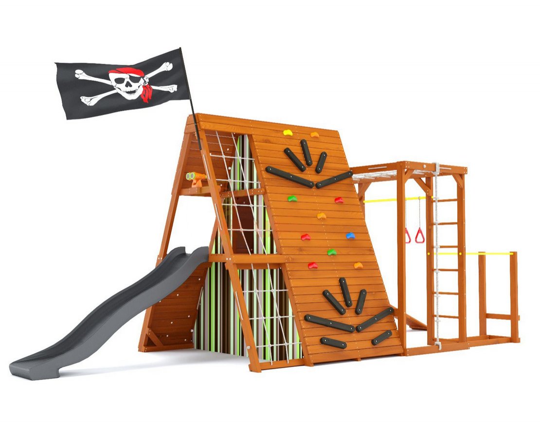 Тематический домик широкого назначения со спортивно-игровыми функциями, внутренняя игровая площадь которого составляет 3,6 кв. метра, а комплект распашных занавесов с подхватами придаст вашему домику уютный и защищённый вид.