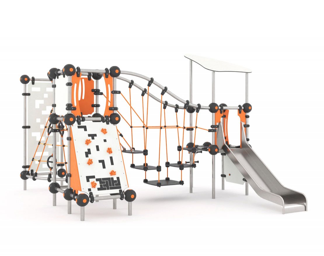 Комплекс представляет собой небольшую полосу препятствий, состоящую из скалодромных панелей, канатной сетки, мостика и открытой горки с защитными бортиками.