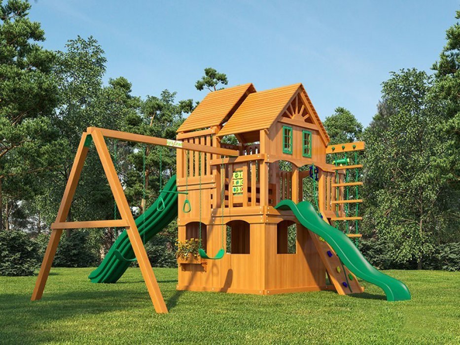 На первом уровне располагается качельный модуль, на котором ваш ребенок сможет отдыхать от активных игр в других частях детской площадки. Качели выполнены из качественных материалов, поэтому они смогут выдержать не только детей, но даже вас. Поверьте, это станет любимым местом вашего отдыха, когда вам нужно будет присматривать за ребенком.