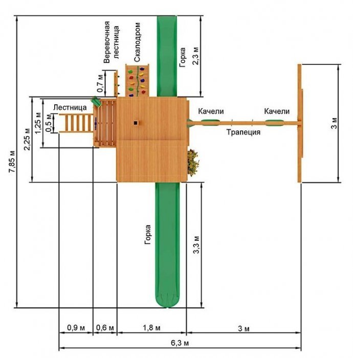 Спуститься обратно вниз малыш сможет при помощи такого элемента, как горка для детской площадки. Одна, небольшая, чем-то по своей форме напоминает волну, а вторая является винтовой, высотой 2,1 метра.