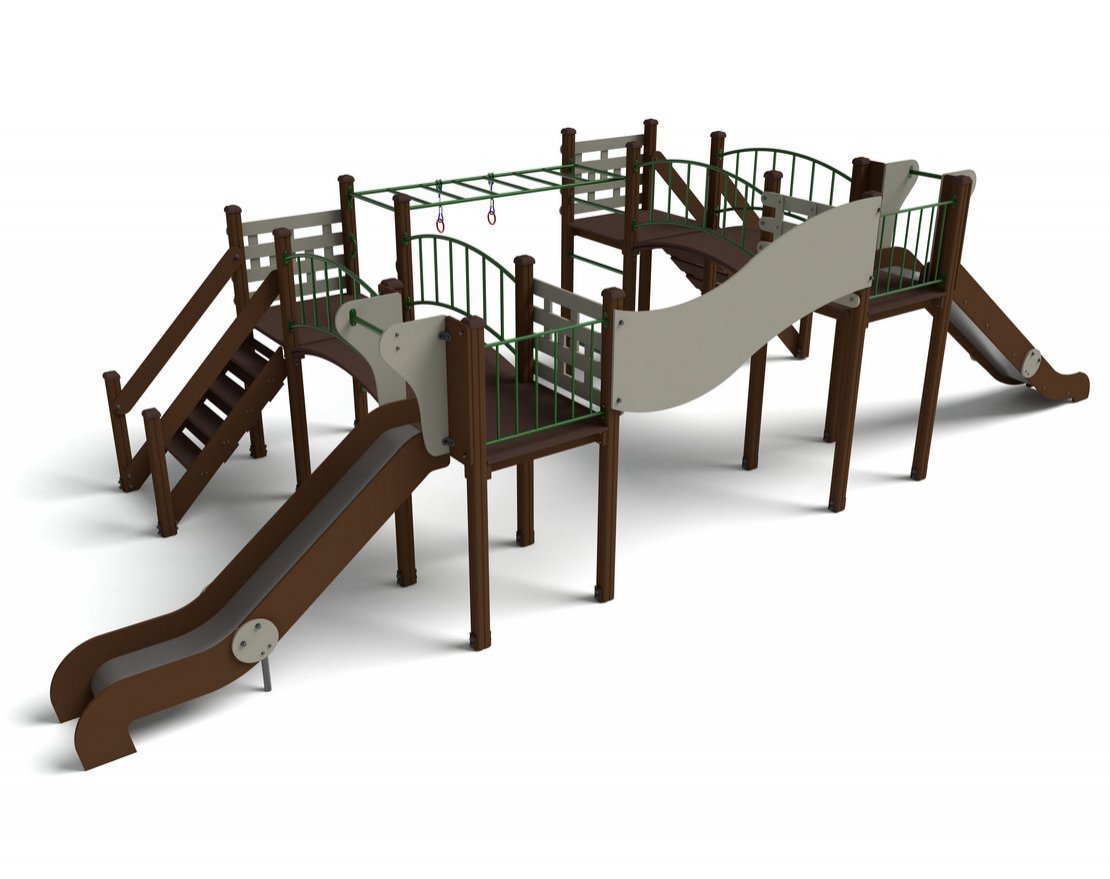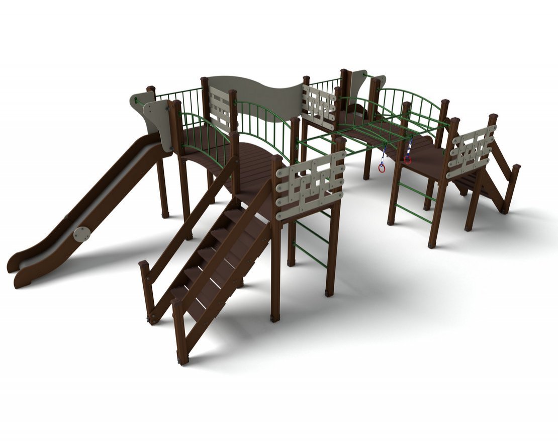 Несущие столбы комплекса должны быть выполнены из клееного бруса сечением 90х90 мм. Снизу столб должен заканчиваться металлическим подпятником сечением Ø 42 мм, который бетонируется в землю. Для увеличения жесткости конструкций на опорные столбы должны крепиться лаги, собранные в шип, на которые закрепляются прогоны полов, изнутри зафиксированные специальными оцинкованными уголками. Деревянные детали должны быть тщательно отшлифованы, загрунтованы и окрашены профессиональными двухкомпонентными красками в заводских условиях. Полы площадок изготовлены из ламинированной фанеры 18 мм.