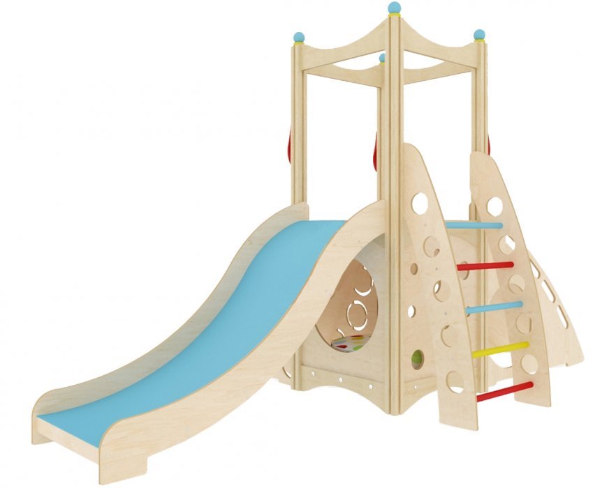 Кроме экологичности изделие привлекает взрослых и детей своим оригинальным продуманным дизайном. Нижняя часть заменит детям домик, где можно уютно уединиться с книгой или обустроить кукольный дом. Наверх позволяет взобраться удобная лестница с крепкими надежными перилами, для самых ловких предусмотрен подъем с элементами скалодрома. Взобравшись на верхнюю площадку, вниз ребенок съедет по идеально гладкой поверхности горки. Форма горки обеспечивает безопасность при скатывании и в то же время создает ощущение свободы и захватывающей дух скорости.