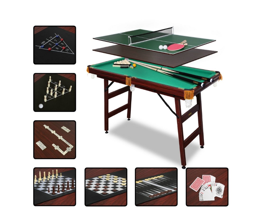 Бильярдный стол Fortuna Русская пирамида 4 фута 9 в 1 - это многофункциональный игровой стол, включающий 9 игр: русский бильярд, шашки, шахматы, нарды, настольный теннис (пинг-понг), кегли, шаффлборд, игральные карты и домино.