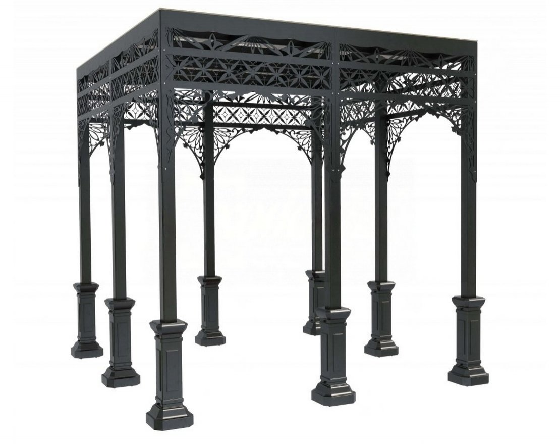 - Элементы фасада крыши (декор): Выполнены из листового проката и профильного проката с художественными элементами. Покрыты порошковой полимерной краской. Стандартный цвет - черный
