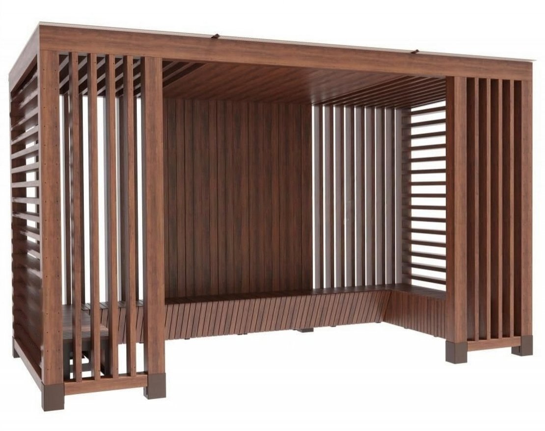 Обшивка: Брус из хвойных пород древесины. Покрытие - атмосферостойкая лессирующая акриловая пропитка с лаком.