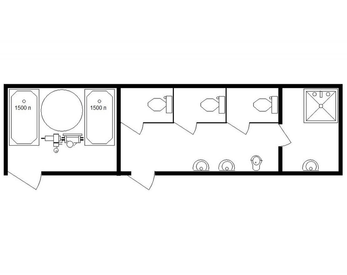 В комбнированном туалетно-душевом блок-контейнере устанавливаются накопительные пластиковые ёмкости для воды и канализационных стоков объемом до 10 тонн каждая. Подача воды из технического отделения в душевой и туалетный отсеки блок-контейнера обеспечивается при помощи станции автоматической подачи воды, а отвод канализационных стоков из душевого и туалетного отделения автономной сантехнической вагон-бытовки осуществляется качественным канализационным насосом с измельчителем. Как правило используются марки насосов: Grundfos Sololift, Unipump Sanivort, SFA и т. д.