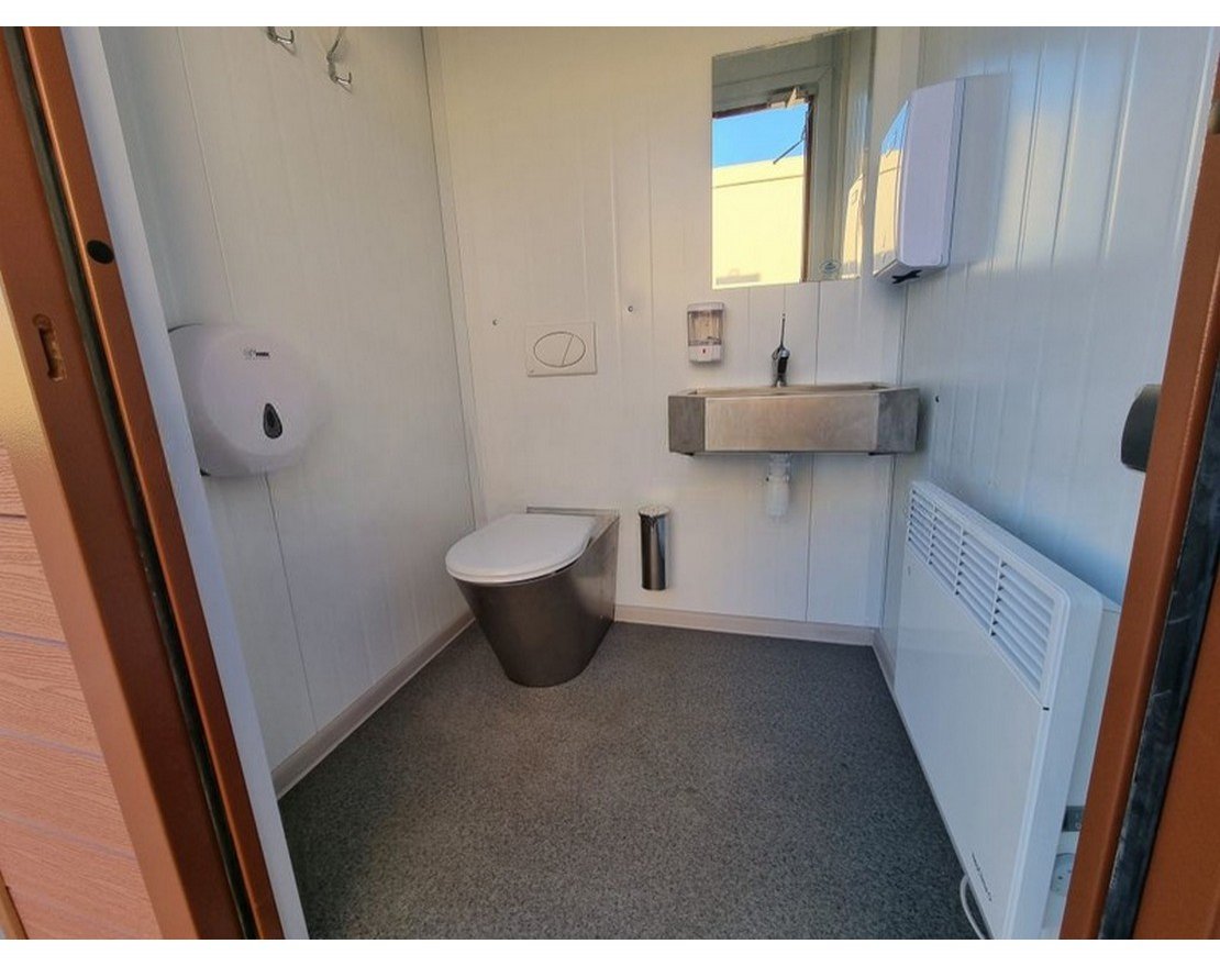 Этот автономный туалетный модуль снабжен двумя туалетными одноместными отделениями: для мужчин или для женщин, для маломобильных групп населения (МГН), а так же техническим помещением с насосным оборудованием и емкостями. Преимущество модели заключается в скрытой прокладке коммуникаций по воде и канализации, которые не будут видны со стороны пользовательских помещений.