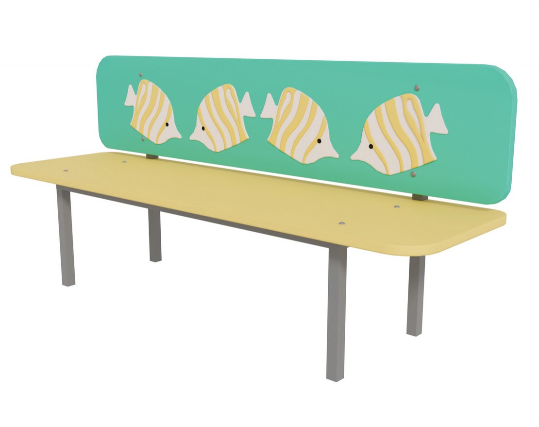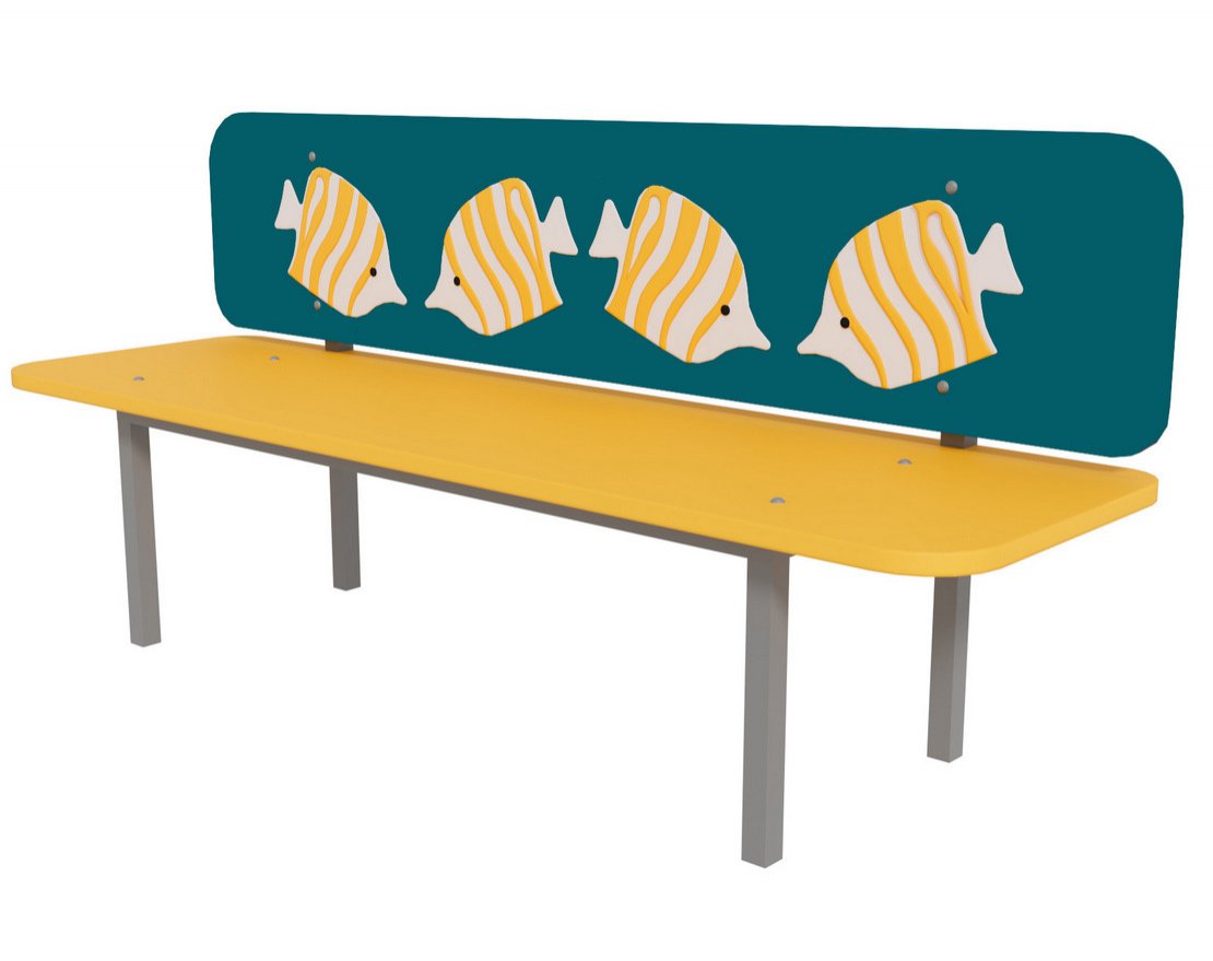 Скамейка уличная служит местом отдыха дошкольников и младших школьников на спортивно-игровых площадках, в скверах, парках, дворах многоквартирных и частных домов. Лавочка отличается красочным видом, привлекающим внимание детей, так как все её детали окрашены в яркий, контрастный цвет. Спинка сиденья украшена декором в виде рыб. Изделие органично впишется в облик детского городка, выполненного в морском стиле, станет дополнительным антуражем для игр.