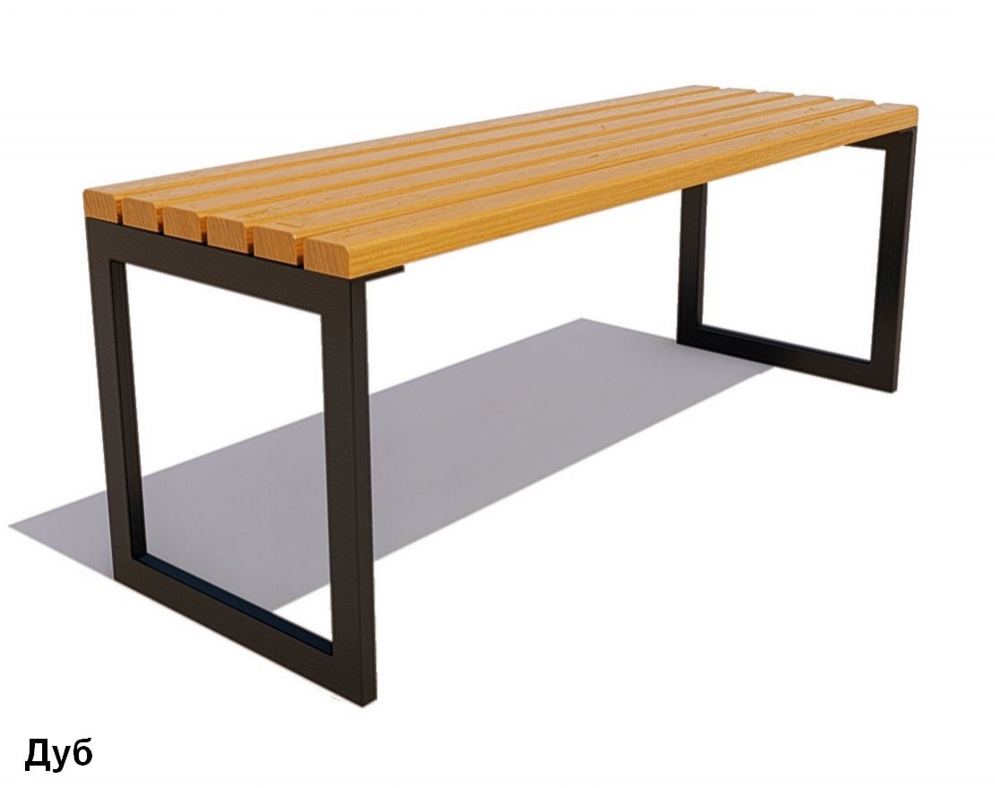 Минималистичная скамейка впишется в ландшафтный дизайн любого стиля. Высокопрочные деревянные брусья надёжно крепятся на стальном каркасе. Эти материалы полностью экологичны, прослужат несколько десятилетий. Отсутствие подлокотников и спинки даёт возможность свешивать ноги по всем сторонам лавочки. Тип крепления — анкерный.