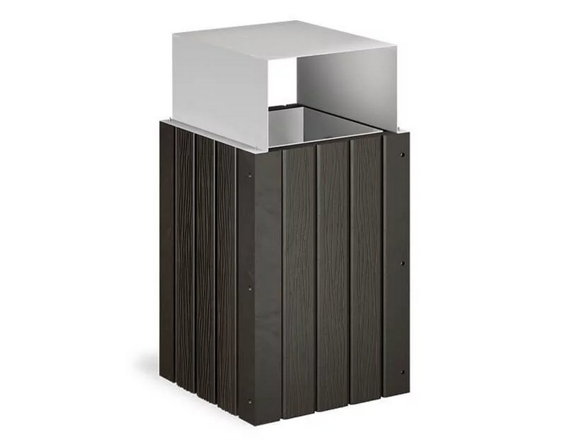Функциональная уличная урна с металлической конструкцией сверху может располагаться у входа в ТЦ, БЦ, магазины и банки, а также дополнять парковые скамьи. Для удобства пользования урна оборудована съемным контейнером для мусора и навесом для защиты от осадков.