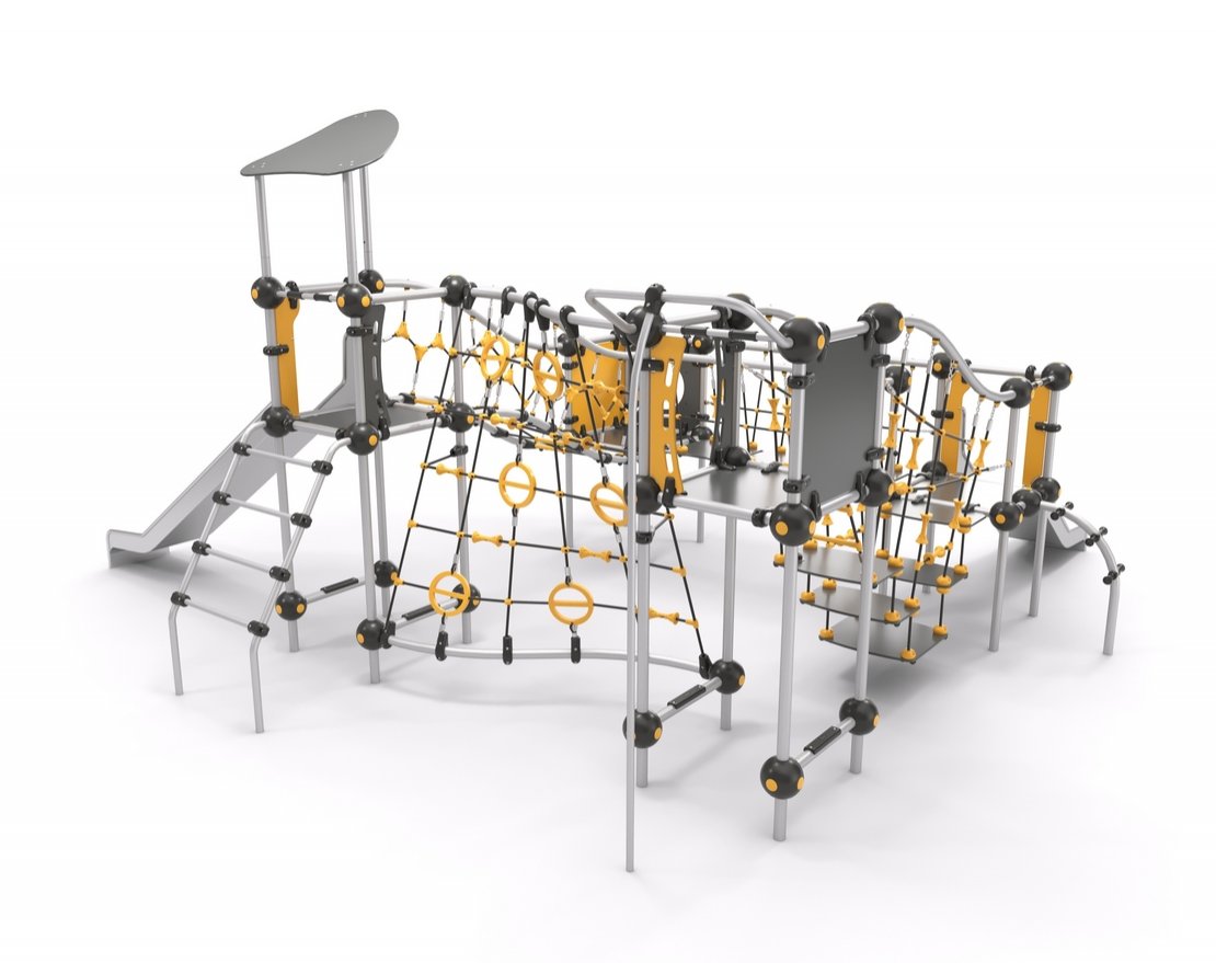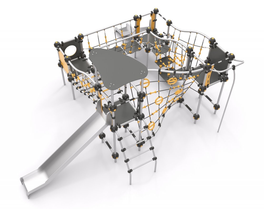 Комплекс представляет собой большое игровое пространство, состоящее из канатных сеток, подвесных мостов, открытых горок с защитными бортиками, вертикальной трубы и вставки с иллюминатором.