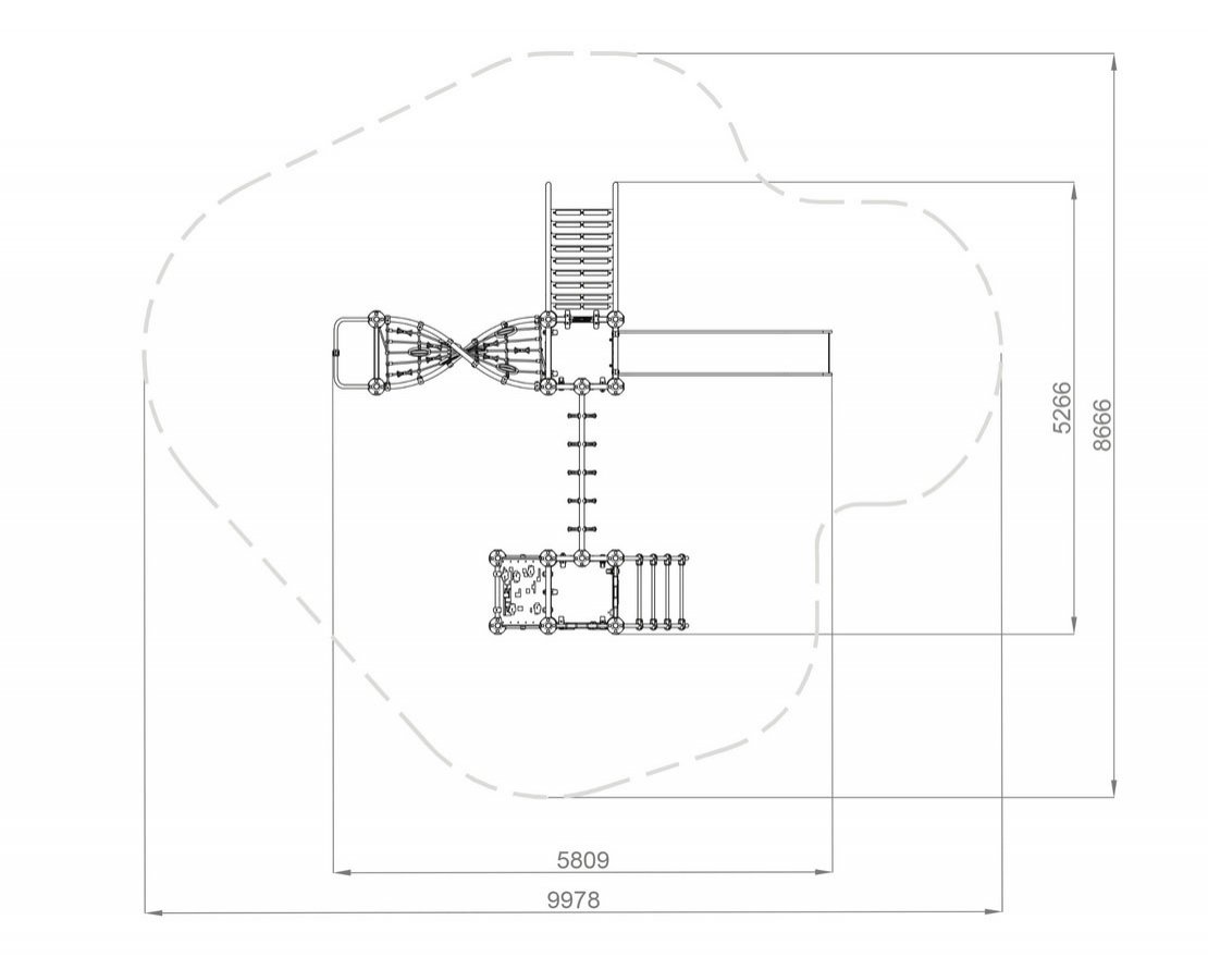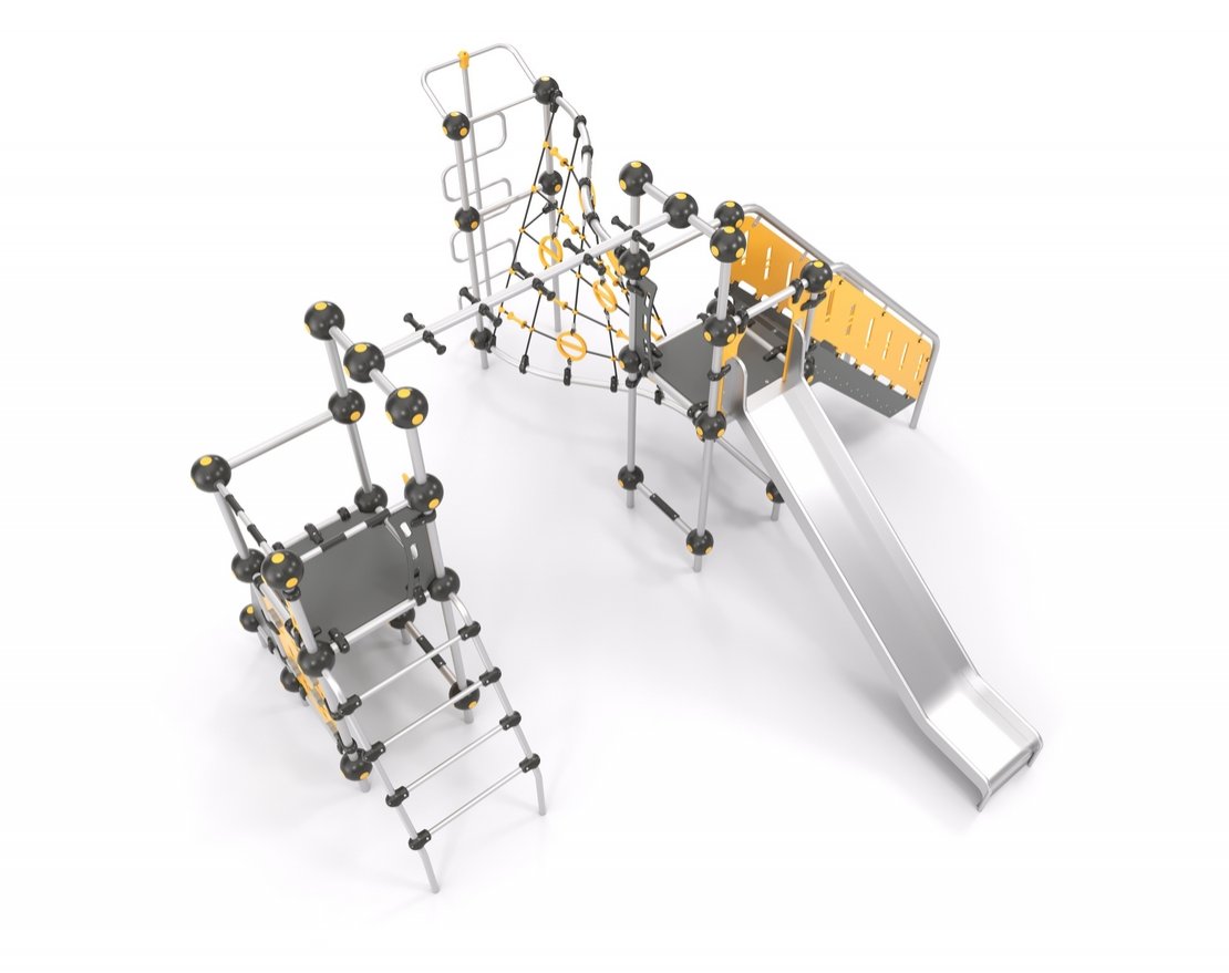 Состоит из металлического каркаса, канатной сетки, открытой горки с защитными бортиками, лестницы и скалодромной панели.