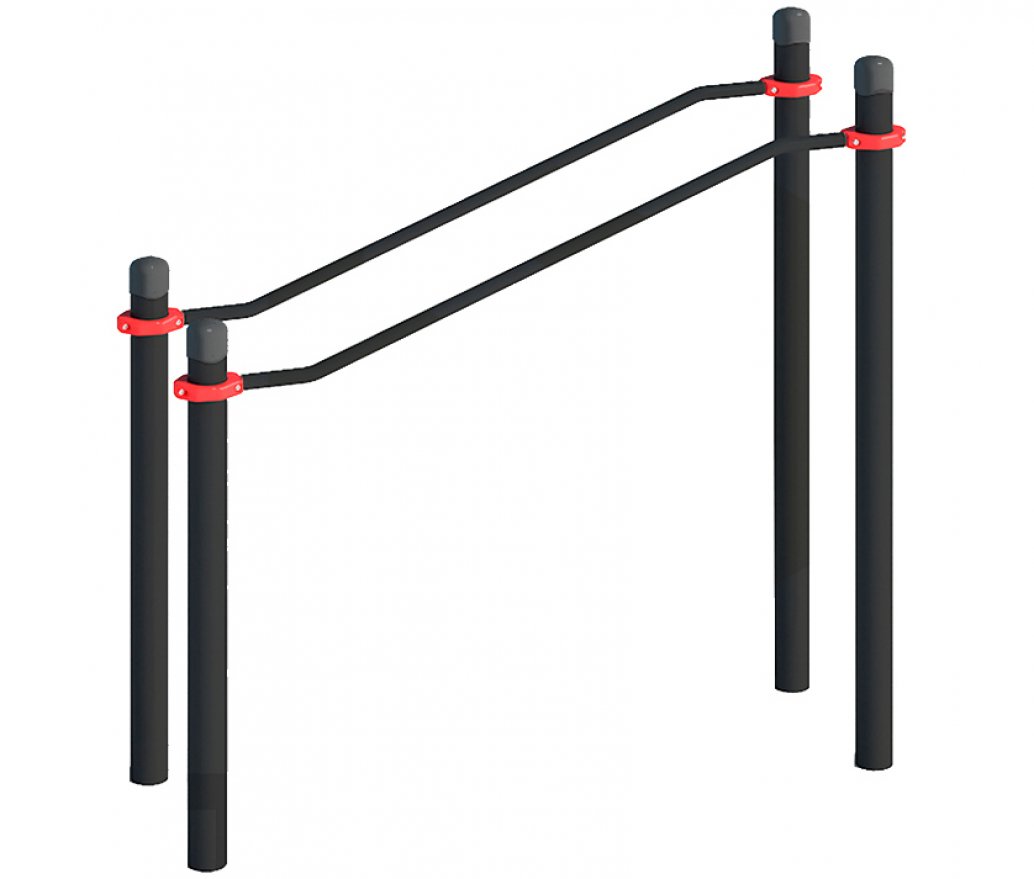 Комплекс состоит из четырех опорных столбов высотой: 2 шт. - 2000 мм, 2 шт. - 1200 мм и двух жердей длиной 1790 мм, концы которых изогнуты к опорным столбам в противоположные стороны под углом 30 градусов. Расстояние между центрами опорных столбов брусьев 608 мм. Жерди крепятся к опорным столбам при помощи хомутов на высоте: 1466 мм - в верхней части и 1000 мм - в нижней части от поверхности основания. Длина комплекса не более 2010 мм.